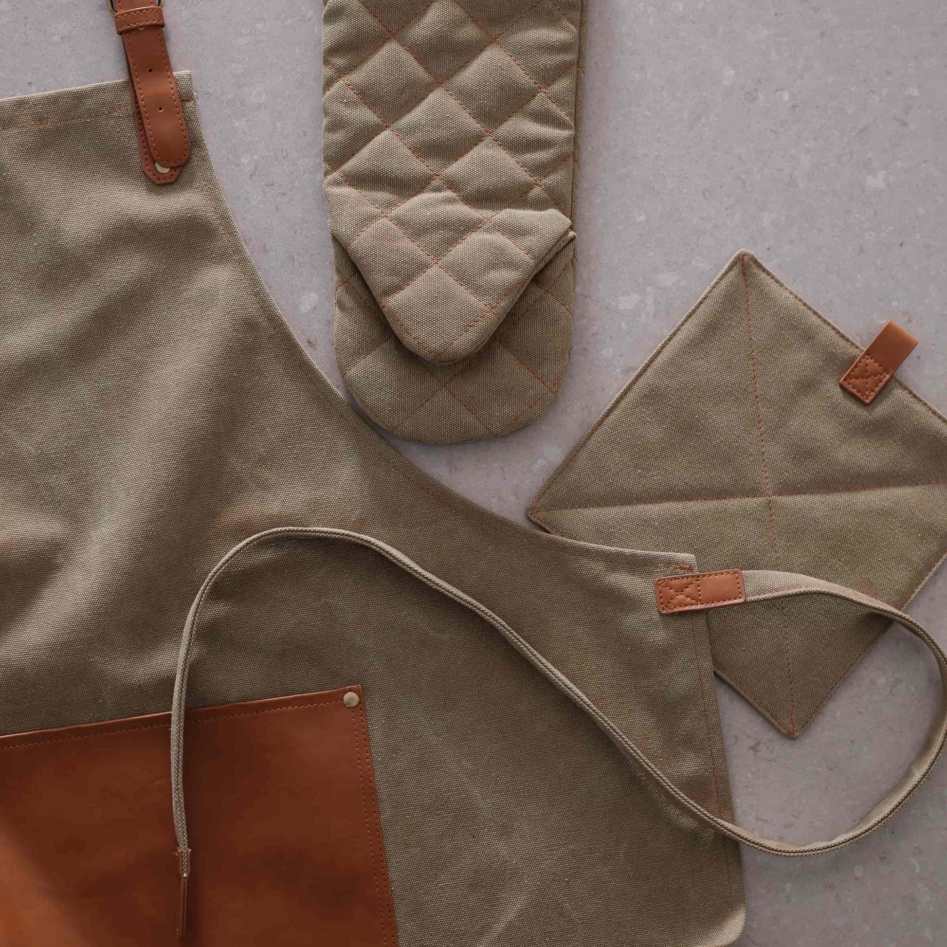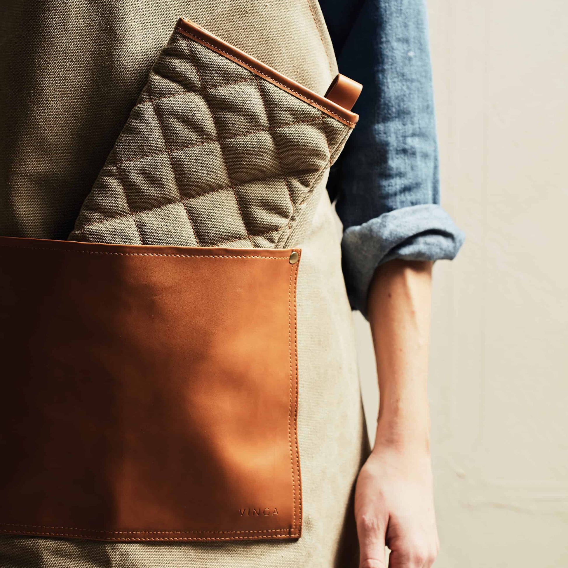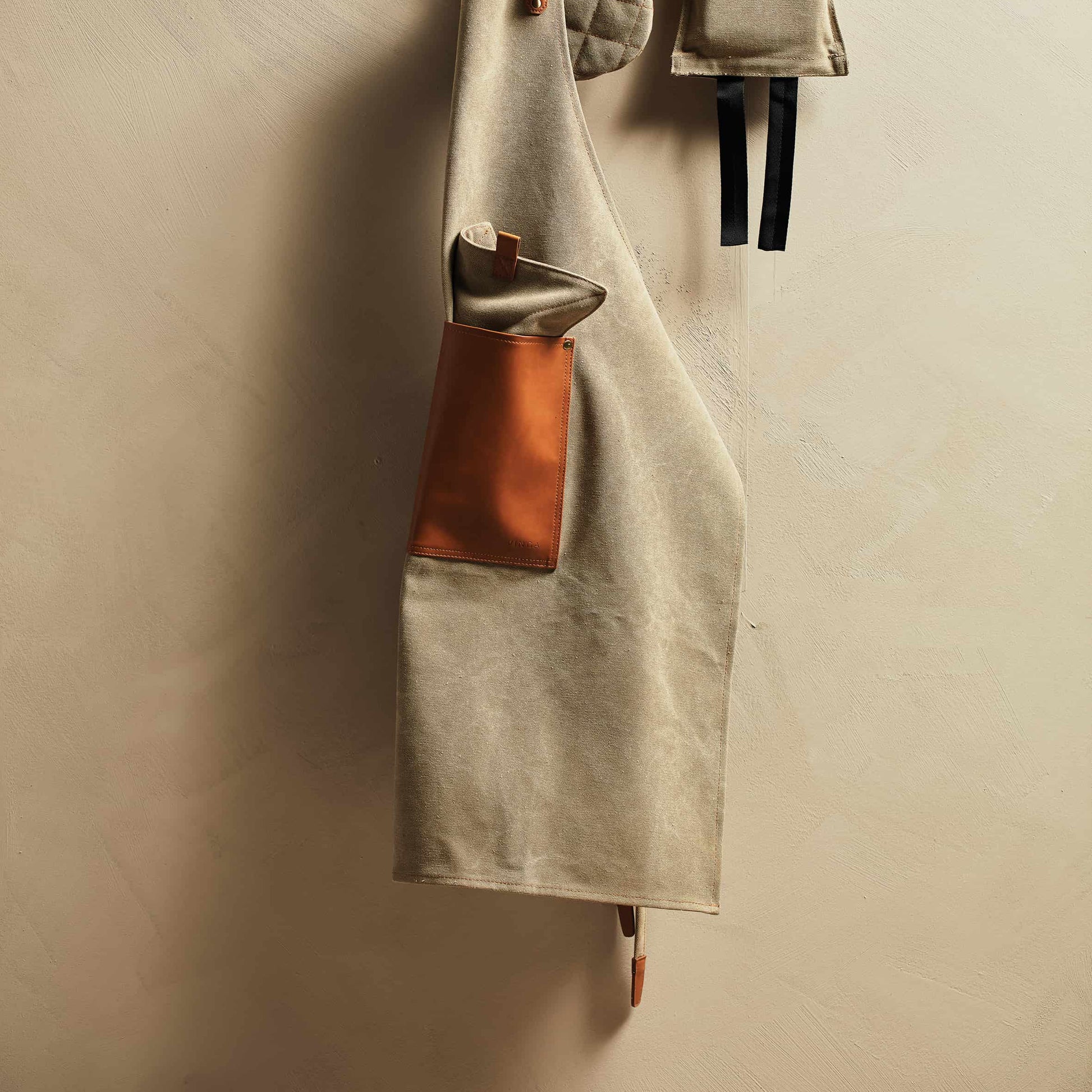 Delantal robusto en lona lavada a la piedra de 500 g/m² con detalles en PU. Un delantal que envejece con dignidad.