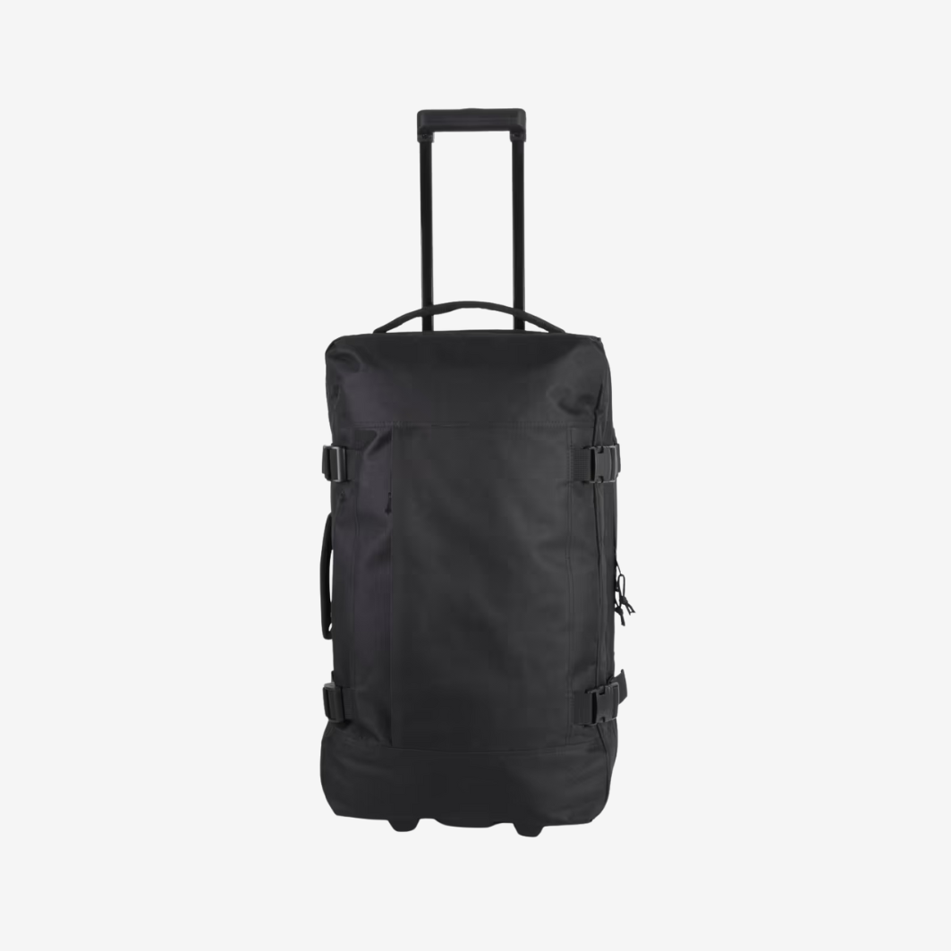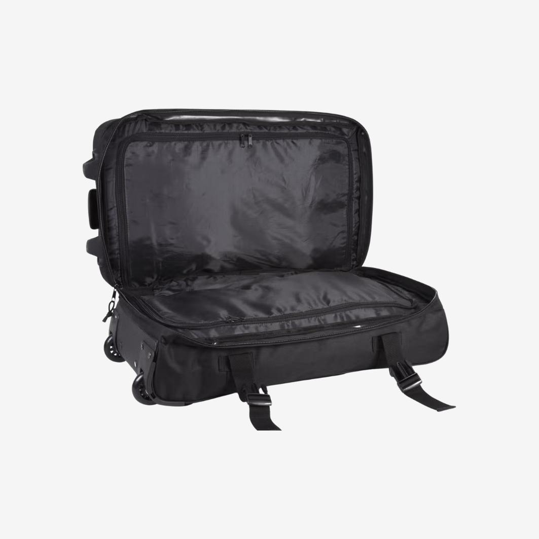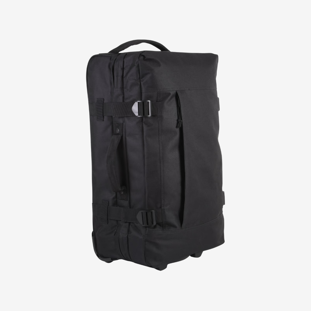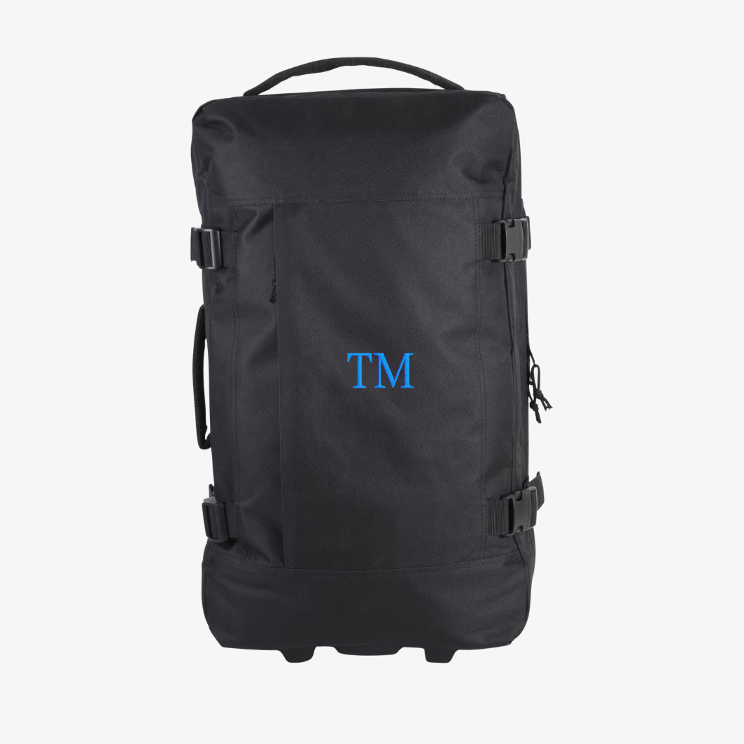 Trolley de poliéster 600D con bolsillo grande con cremallera en la parte delantera para facilitar la personalización. Dos compartimentos interiores con cremallera y correas de sujeción. Sistema de trolley retráctil. Asas de compresión para ajustar el volumen. Base con revestimiento protector texturizado y costuras reforzadas en las asas
