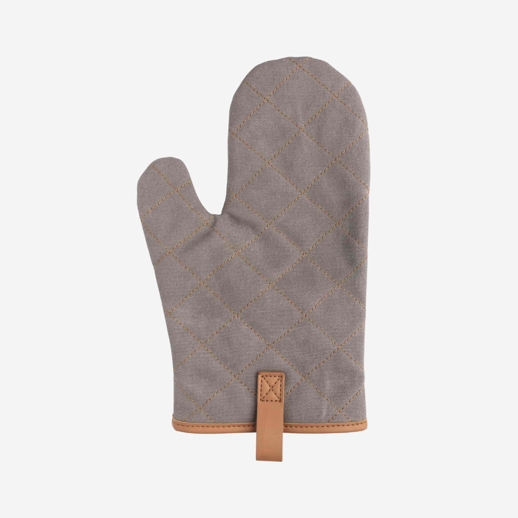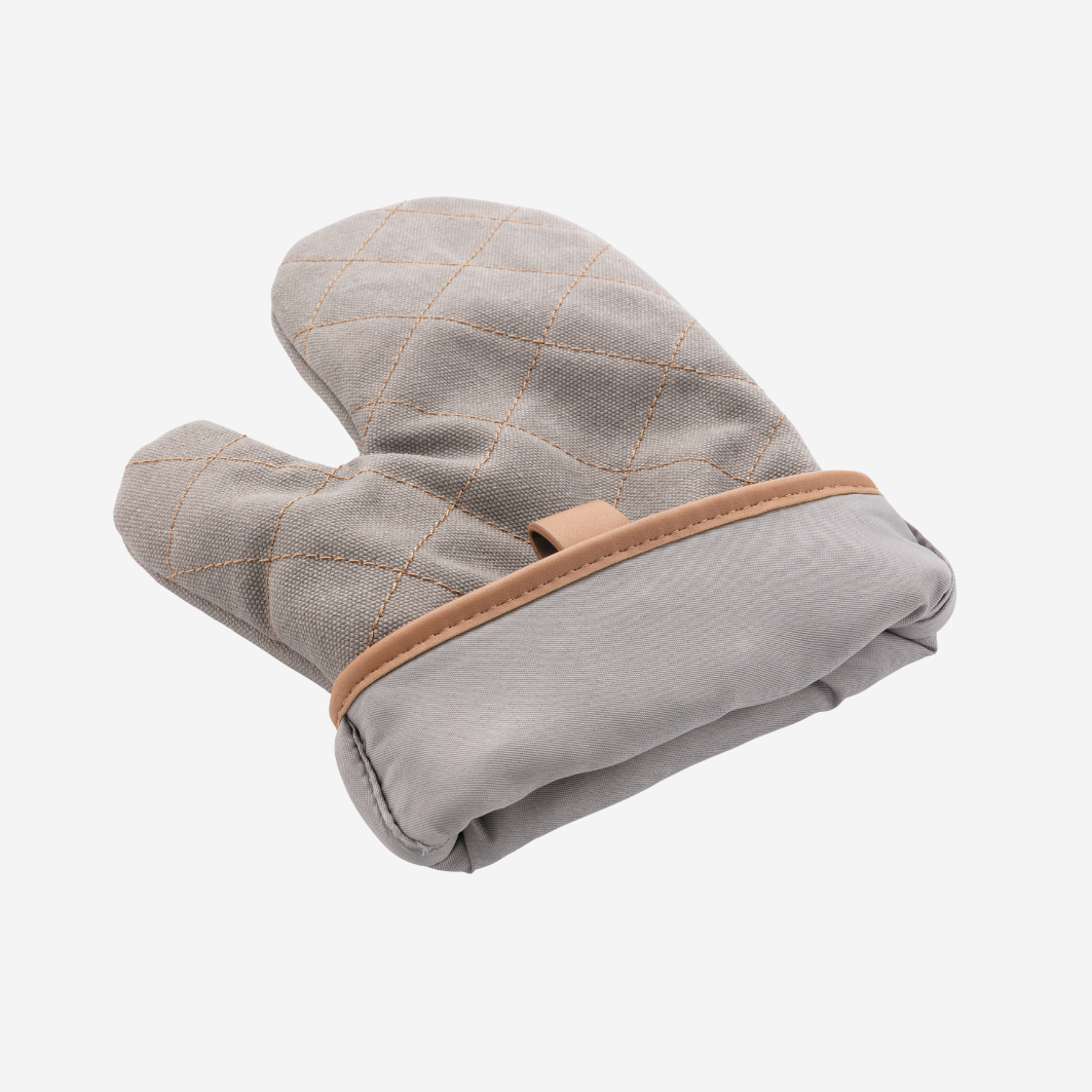 Un práctico compañero en la cocina, este guante acolchado para horno protege tus manos de objetos calientes. El pulgar separado asegura un buen agarre, unido con detalles decorativos de PU. Hecho con alta calidad de 16 oz. lona. Viene en caja de regalo kraft. Apto lavadora a 30 grados con colores similares.