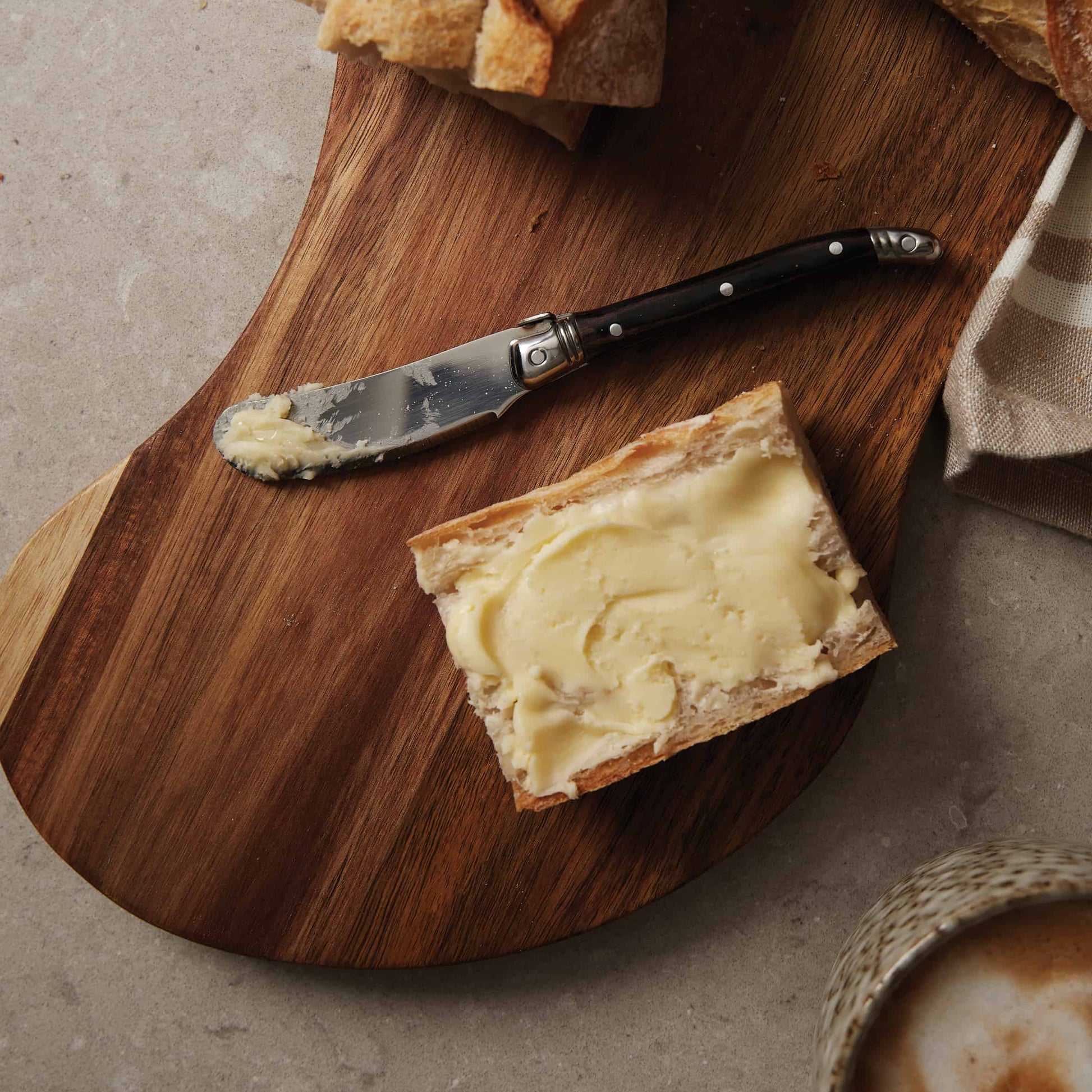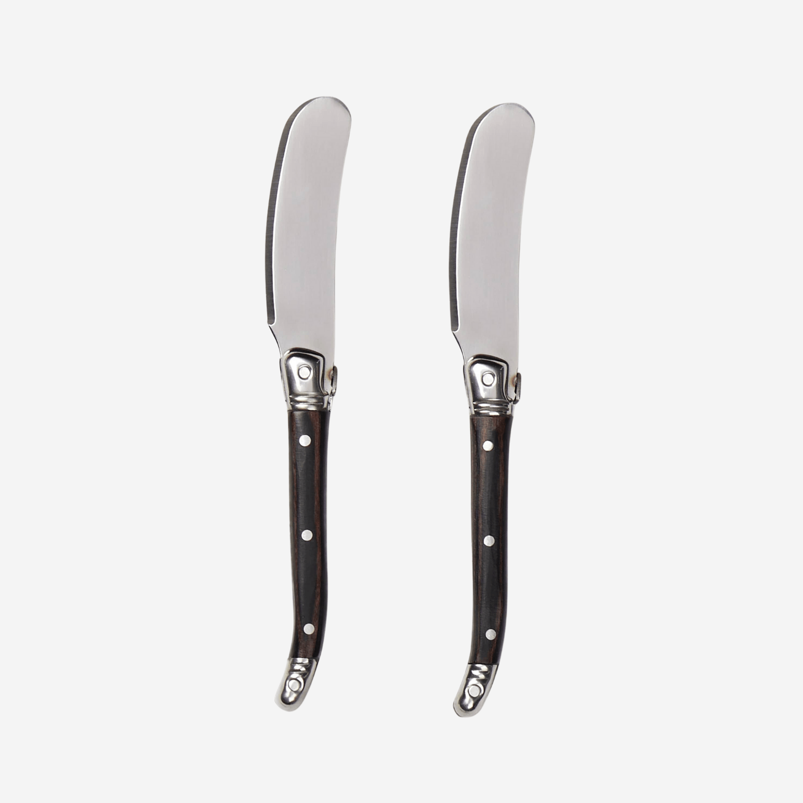 Exclusivo juego de cuchillos para mantequilla de acero inoxidable de 2 piezas. Estos cuchillos son perfectos para untar mantequilla o mermelada en tostadas, bagels, muffins y más. Las cuchillas de acero inoxidable de alta calidad garantizan un esparcimiento suave y sin esfuerzo, mientras que los resistentes mangos de madera pakka brindan un agarre cómodo. El set viene presentado en una exclusiva caja de regalo, lo que lo convierte en un regalo ideal para cualquier ocasión.