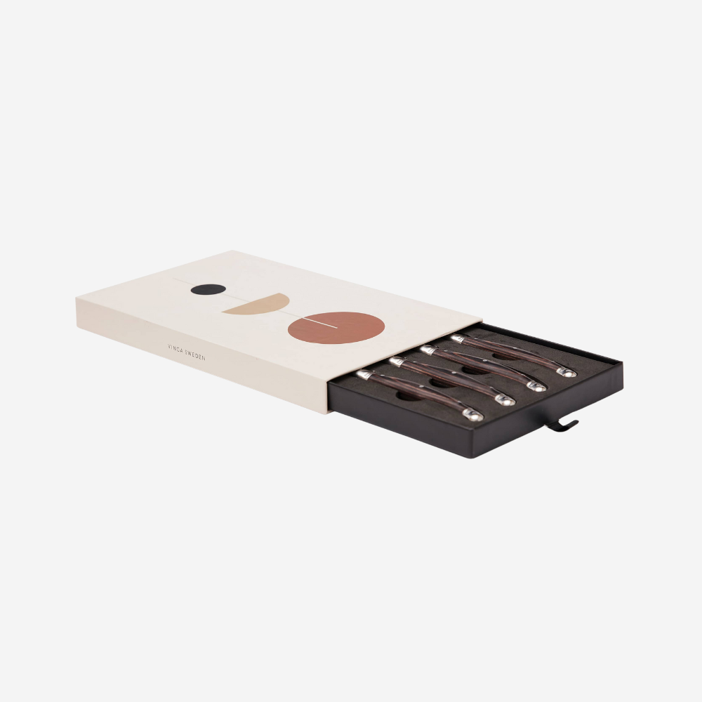 Cuchillos para carne de alta calidad con el típico estilo bistró de inspiración francesa. Mango de madera pakka negra y hojas de acero inoxidable de alta calidad. La cuchilla tiene un rallado fino que le permite cortar los alimentos con la menor resistencia posible. Un juego de cuatro cuchillos que puedes combinar fácilmente con tus tenedores en casa. Empaquetado en una exclusiva caja de regalo.